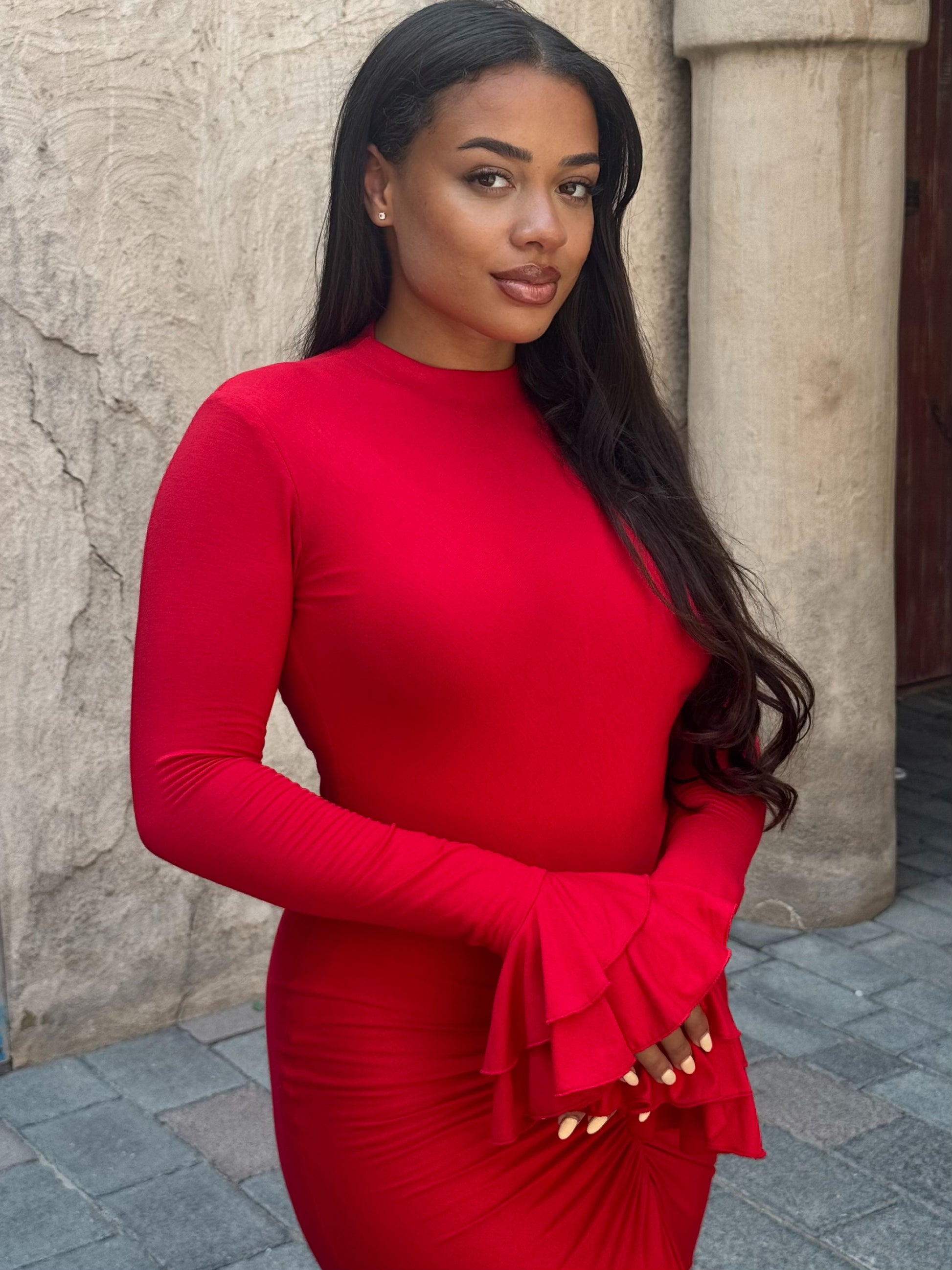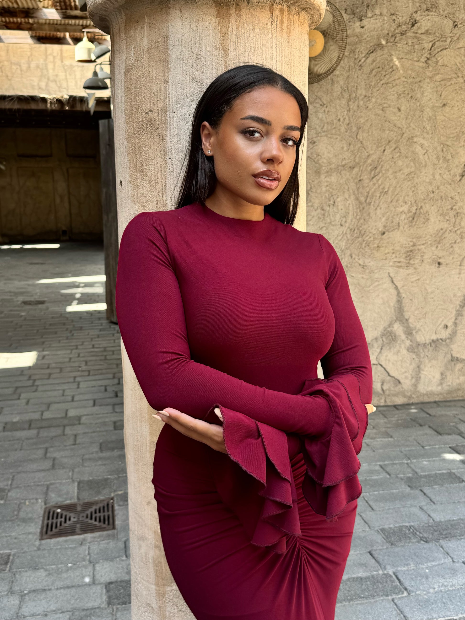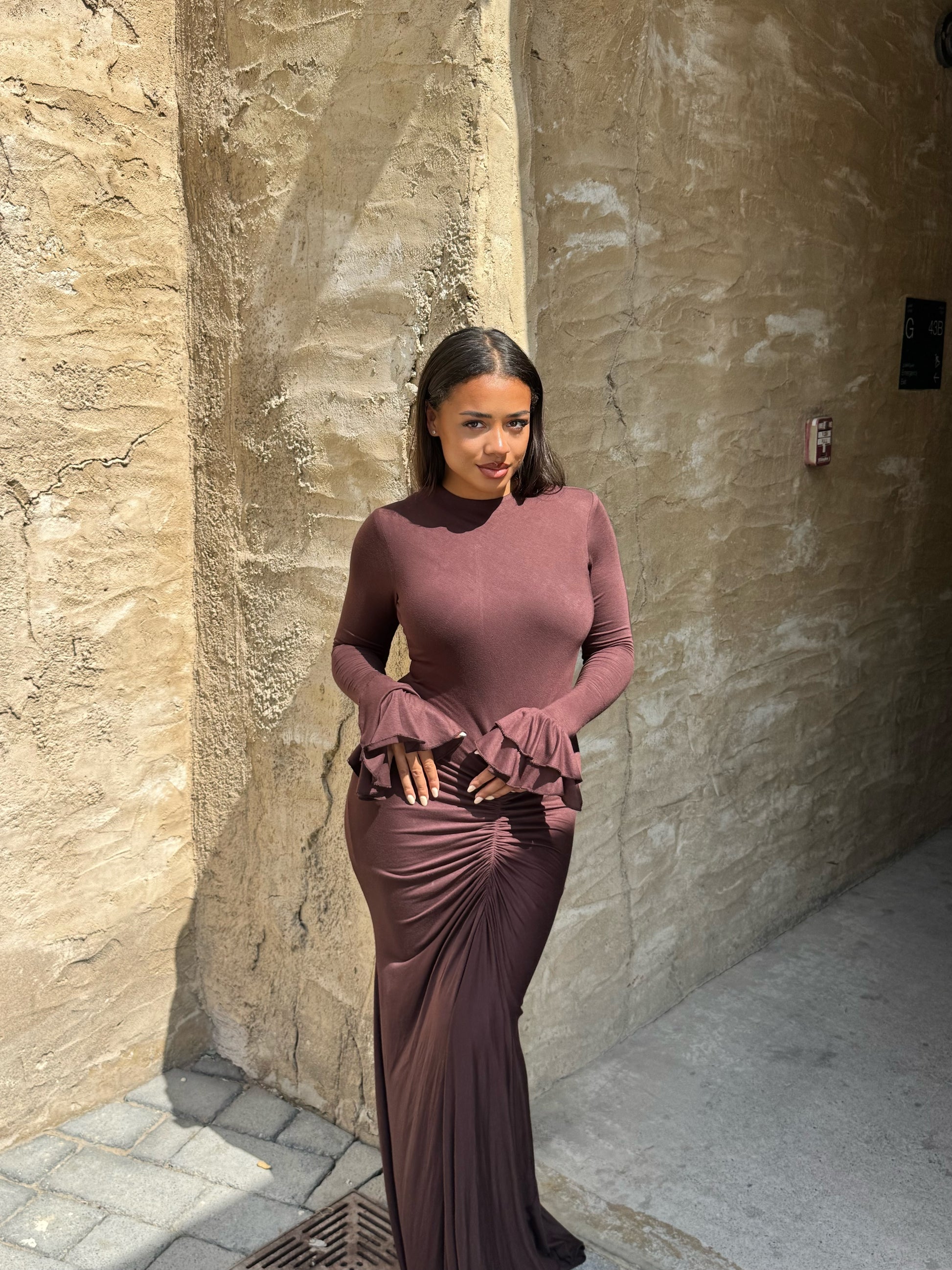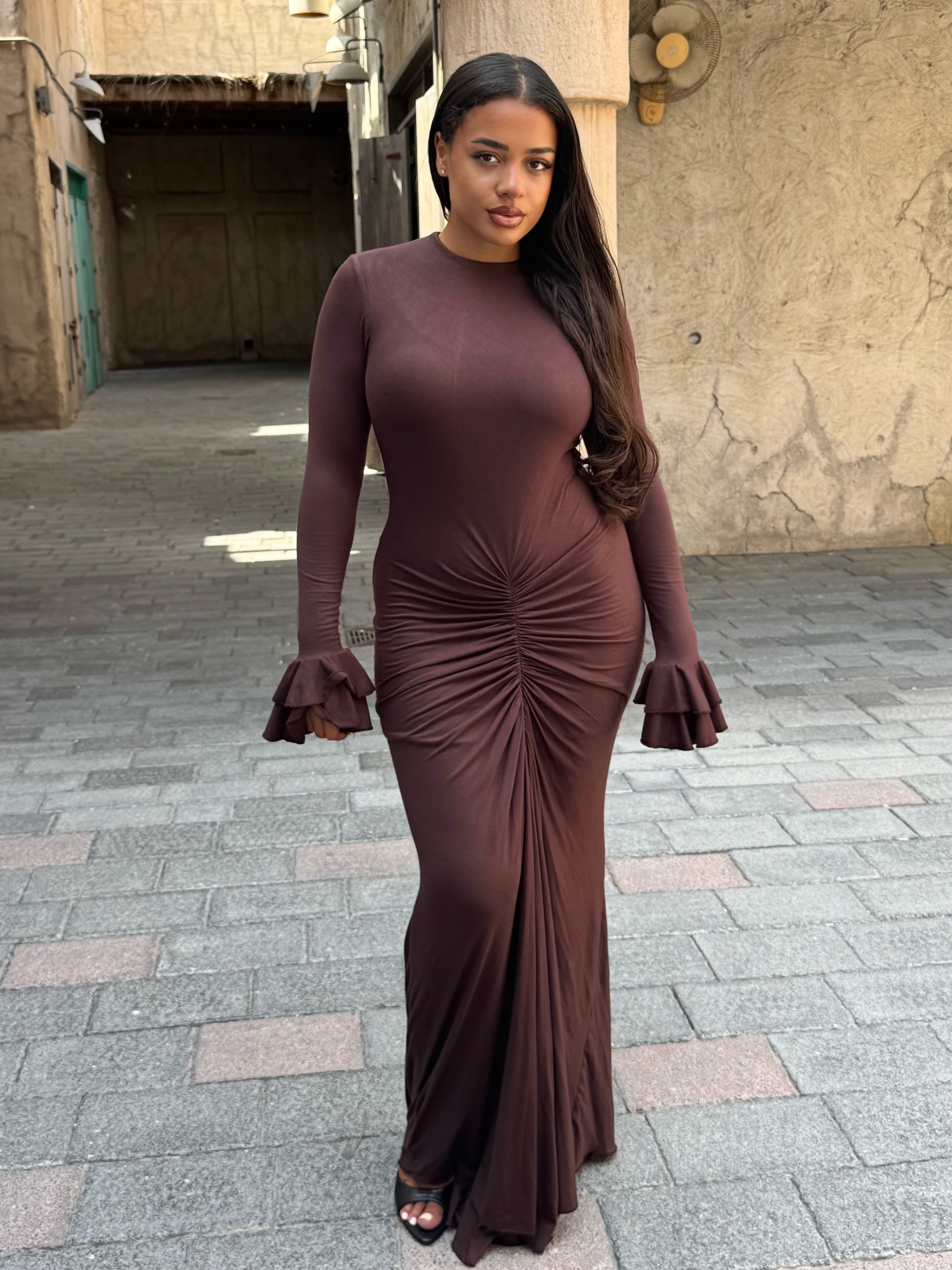 The Allure Gown is the epitome of timeless elegance and feminine grace. Crafted from luxuriously soft stretch jersey, it features a high neckline, sculpted silhouette, and artful ruched detailing that accentuates the waist before flowing into a floor-length hem. Fluted cuffs add a romantic touch, creating the perfect balance between classic and modern. Designed for evenings that call for effortless sophistication. Features: High neckline with long sleeves Statement ruched waist detailing Flared cuffs for a refined finish Full-length silhouette