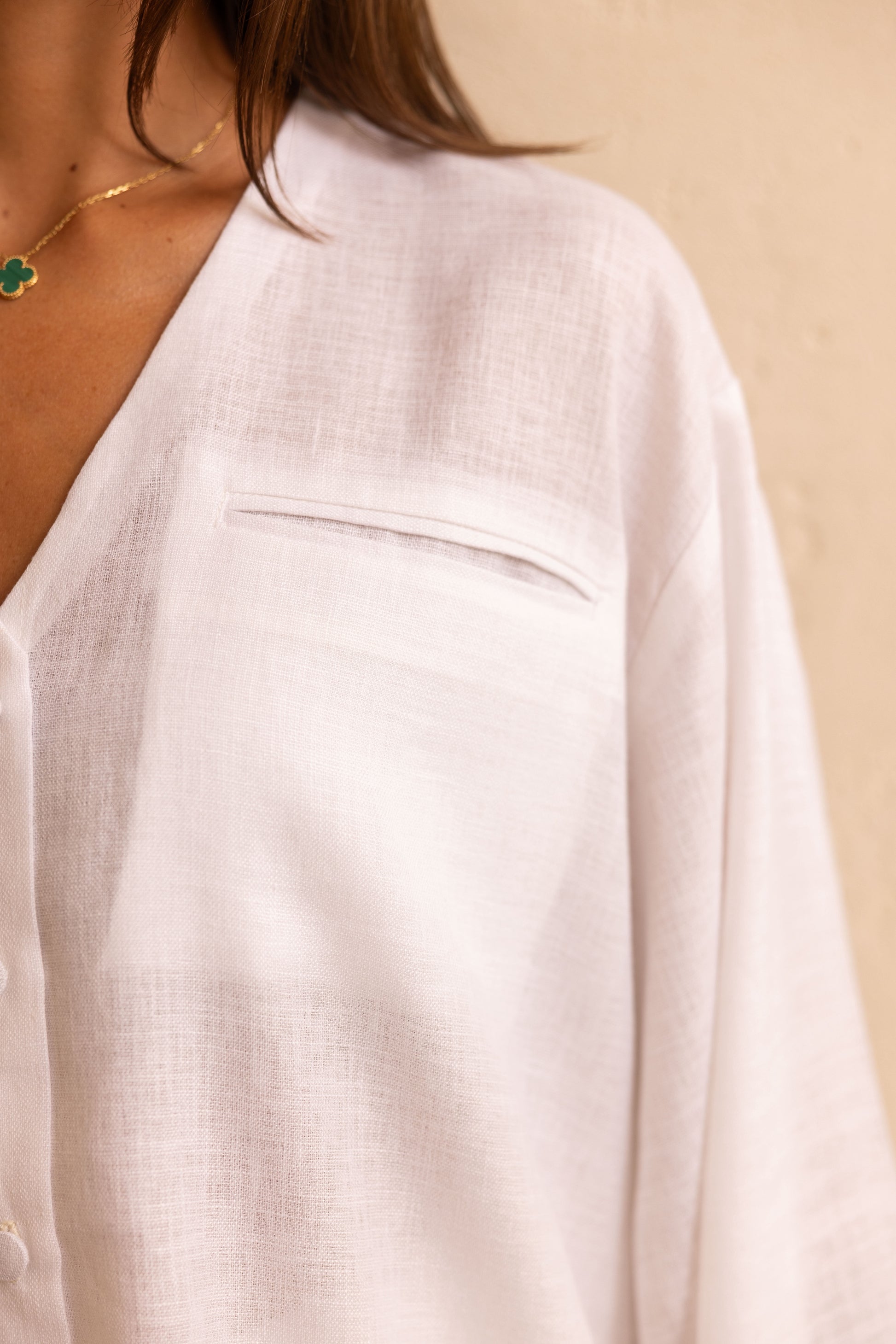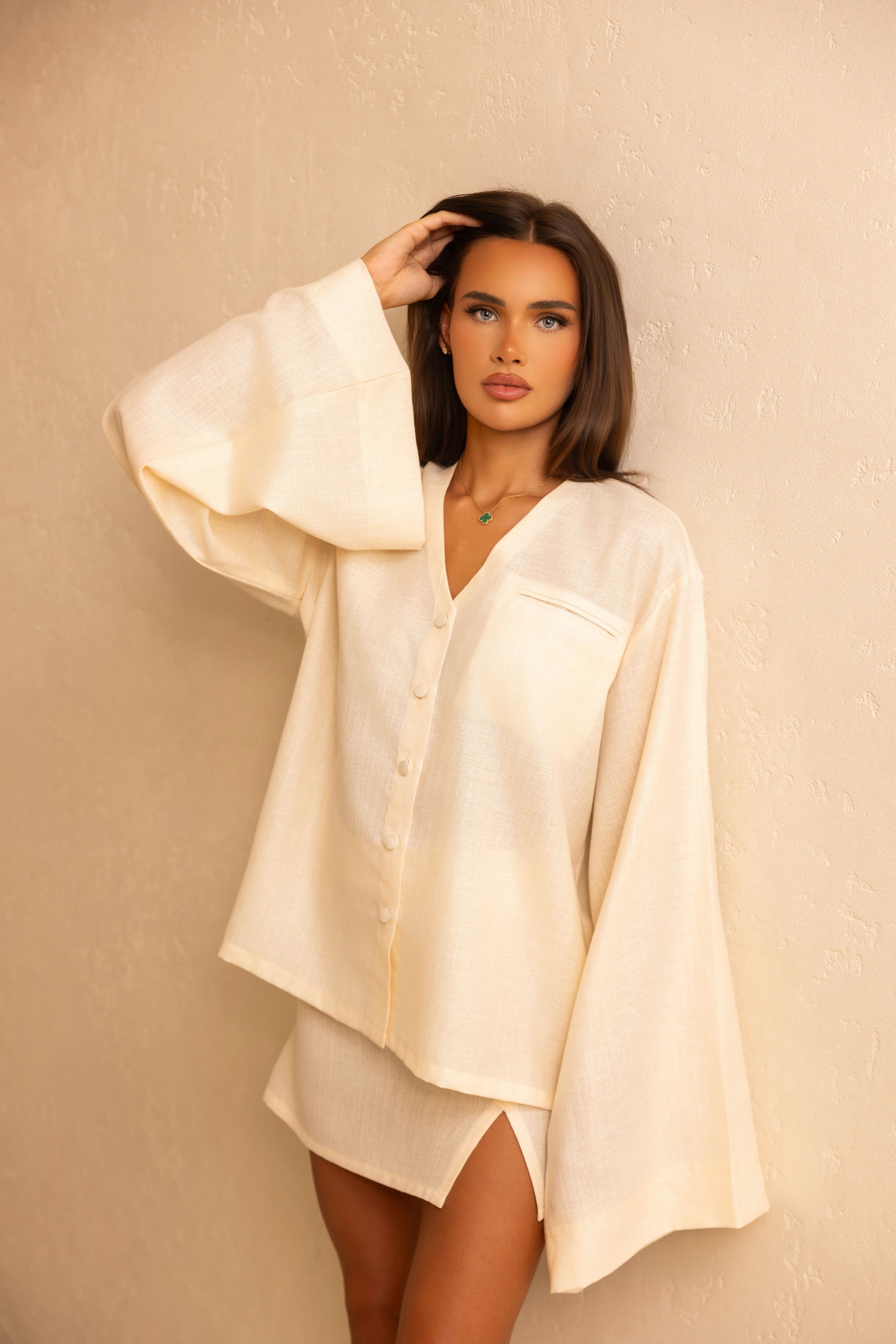 Effortlessly chic and softly structured, the Morning Asa Shirt blends comfort with elevated minimalism. Crafted from a luxurious mix of cotton, linen, and rayon, this lightweight shirt drapes naturally and feels cool against the skin — perfect for warm days and relaxed styling. Designed with a modern V-neckline, tonal buttons, a discreet chest pocket, and oversized sleeves, this shirt is a fresh take on classic resort wear. Wear it loose over shorts, tucked into trousers, or layered as a light outer layer — the Asa Shirt transitions seamlessly from indoors to outdoors, day to night. Key Features: Cotton-linen-rayon blend for breathability and softness V-neckline with tonal front buttons Oversized fit with wide sleeves Hidden chest pocket detail Lightweight feel with a smooth finish Care Instructions: Cold hand wash or machine wash on delicate. Air dry flat. Low iron if needed. Perfect for: Brunches, coastal escapes, lounging, and elevated off-duty looks. Jemima is xs and 172cm and wears a size xs