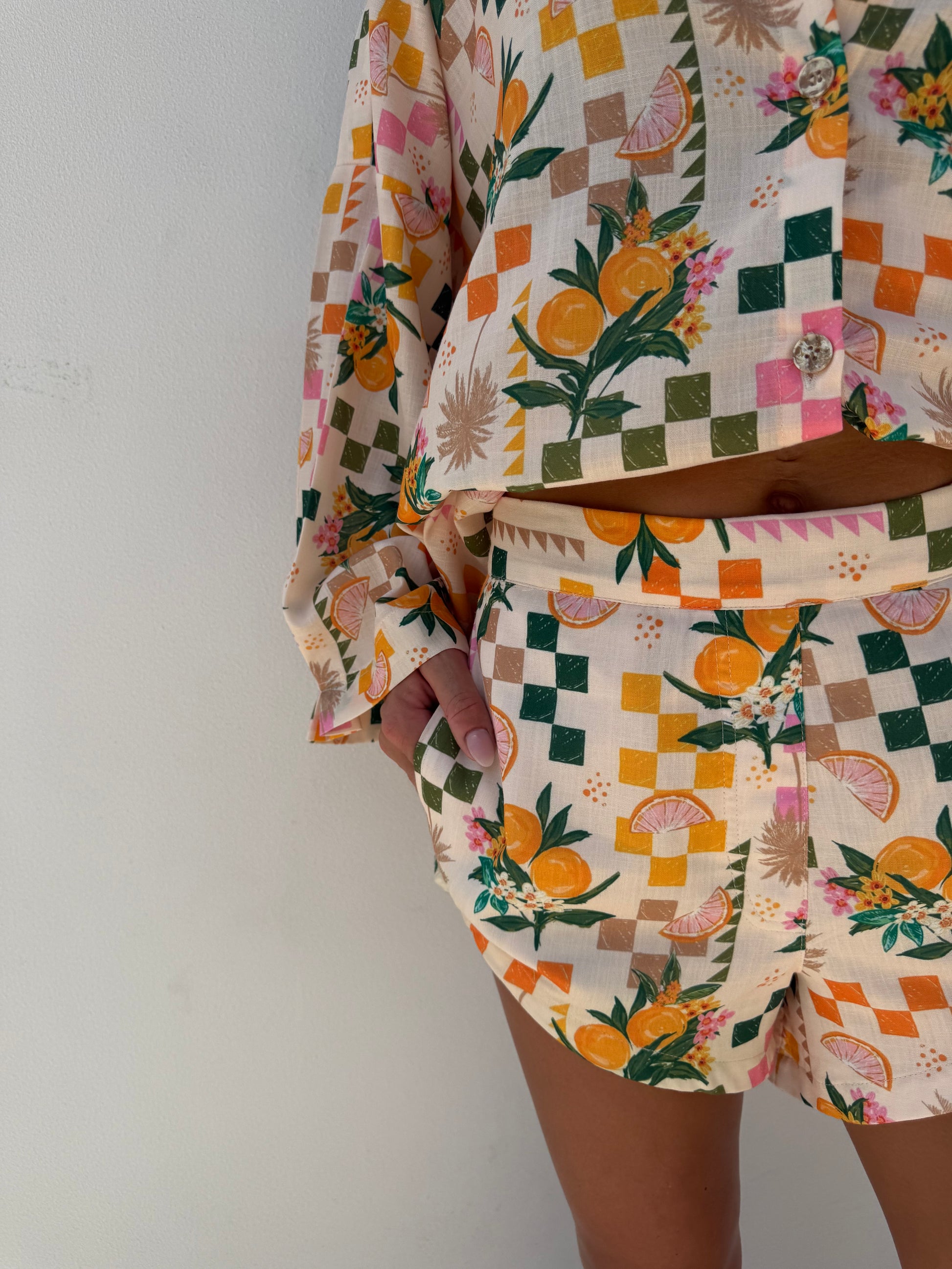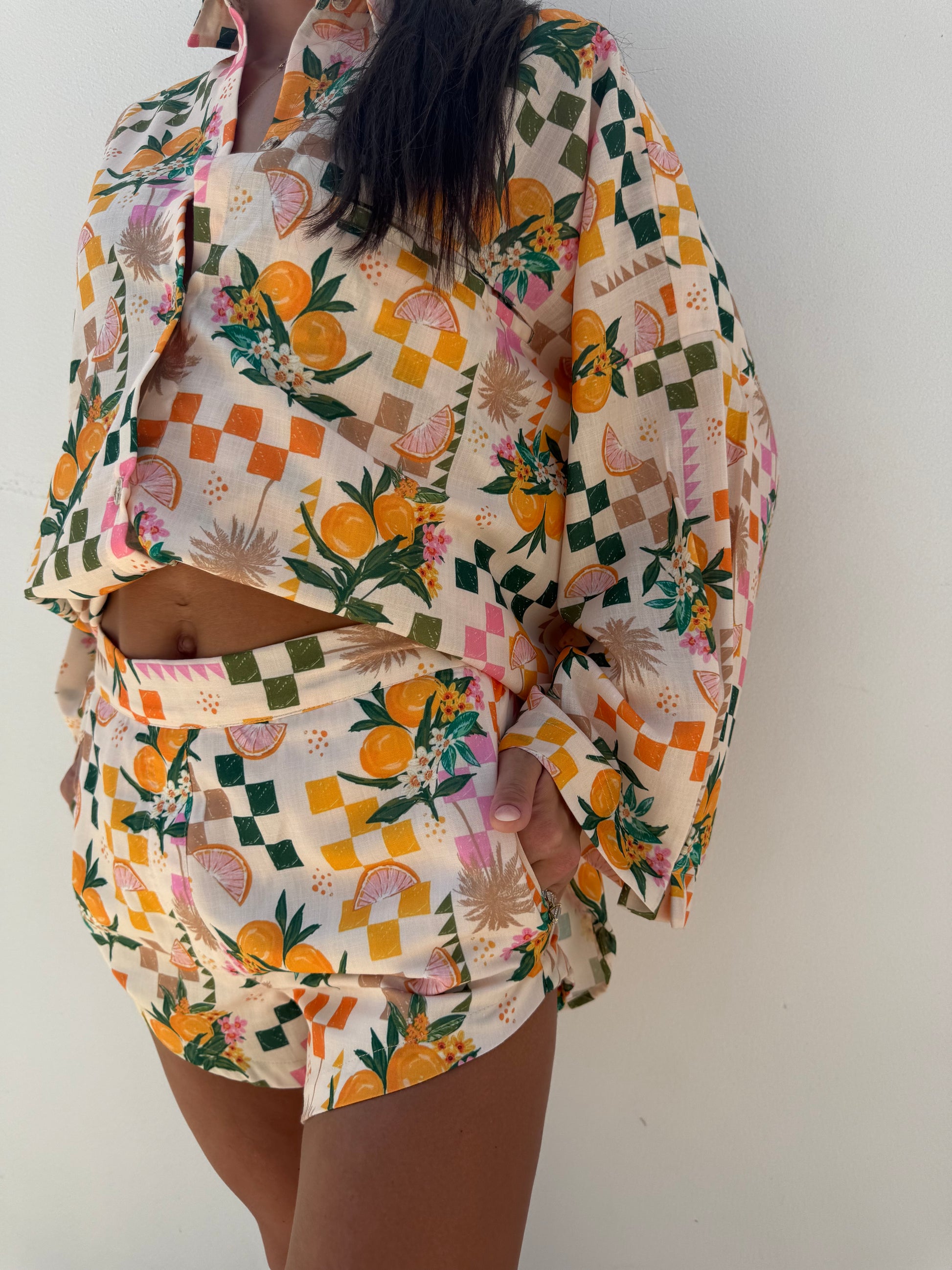 A lightweight linen shirt featuring a vibrant citrus and mosaic print. Designed with a relaxed fit and soft tailoring, it captures the brightness of summer mornings and effortless Belle Chose elegance.