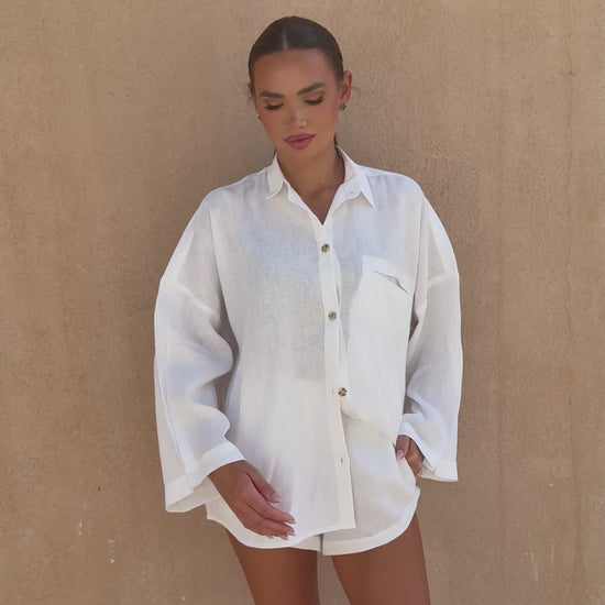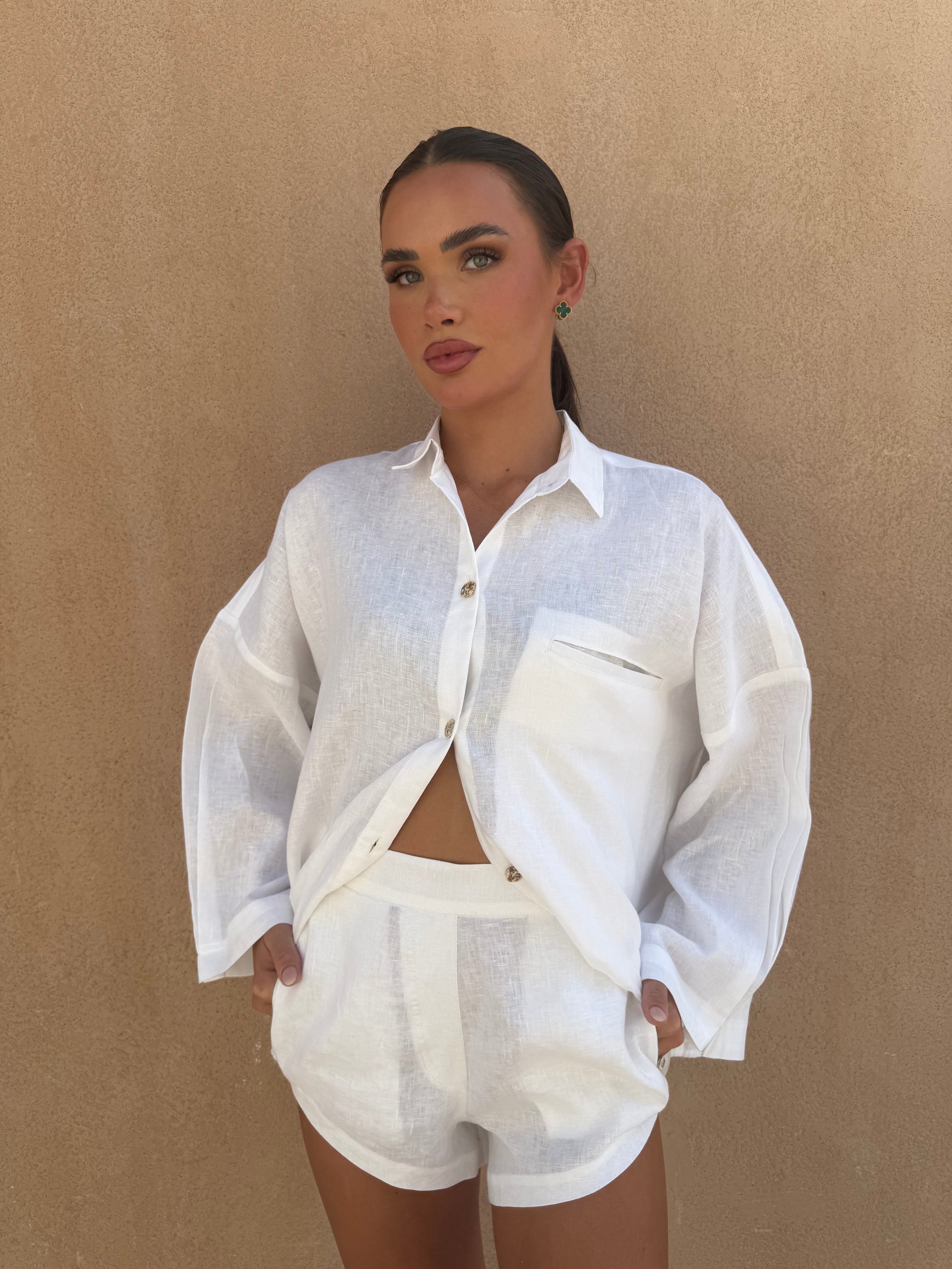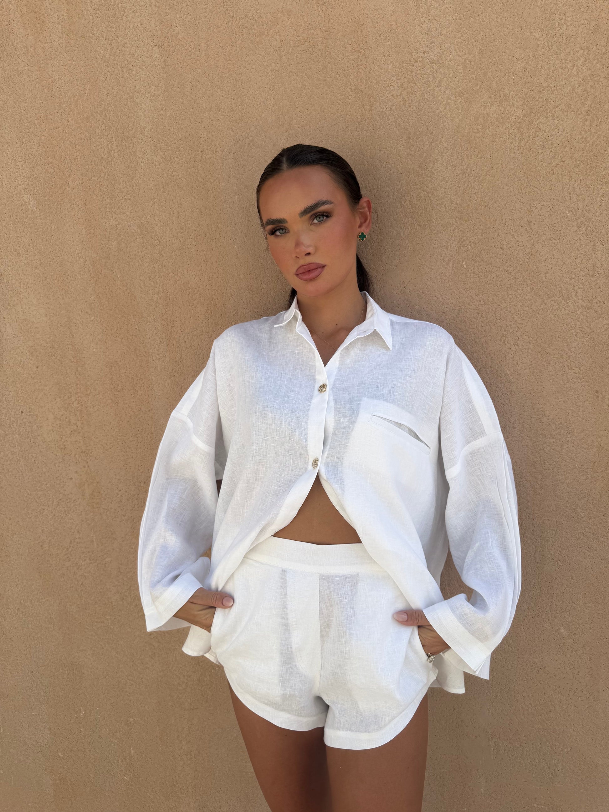 The Blanche Soleil Shorts bring ease and comfort to everyday dressing. Made from 100% linen, they feature a relaxed mid-rise fit and practical side pockets, combining timeless style with everyday functionality. Light, airy, and endlessly versatile, they’re perfect for warm summer days. Details: 100% pure linen, soft and breathable Mid-rise with elasticated waistband Side pockets for functionality Relaxed fit for ease of movement Ethically produced in small batches Style Notes: Wear with the Blanche Soleil Shirt for a complete set, or pair with a simple tank or camisole for laid-back sophistication.