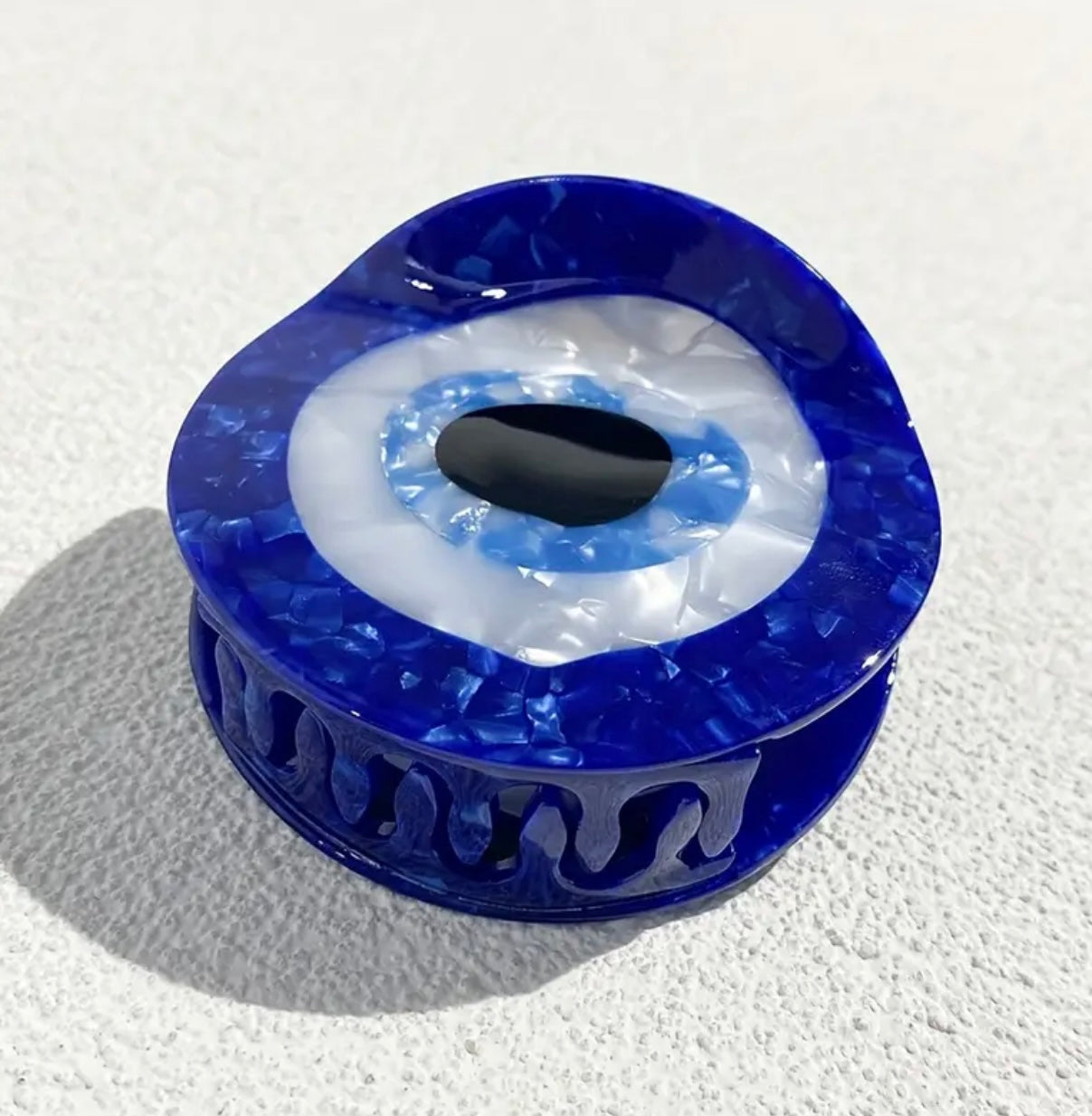Channel calm and protection with Œil Bleu hair clip – a striking accessory inspired by the iconic evil eye symbol. Handcrafted from high-quality resin with a marbled blue, white, and pearlescent shell finish, this unique clip offers both beauty and function. Its secure claw grip makes it perfect for everyday styling, while the elegant design adds a coastal-chic touch to any look. Whether you’re elevating a minimalist outfit or taming your hair with intention, this clip is your go-to statement piece. Details: Durable resin with a high-shine finish Strong claw grip for all hair types Eye motif for symbolic charm Size: 7cm x 6.3cm
