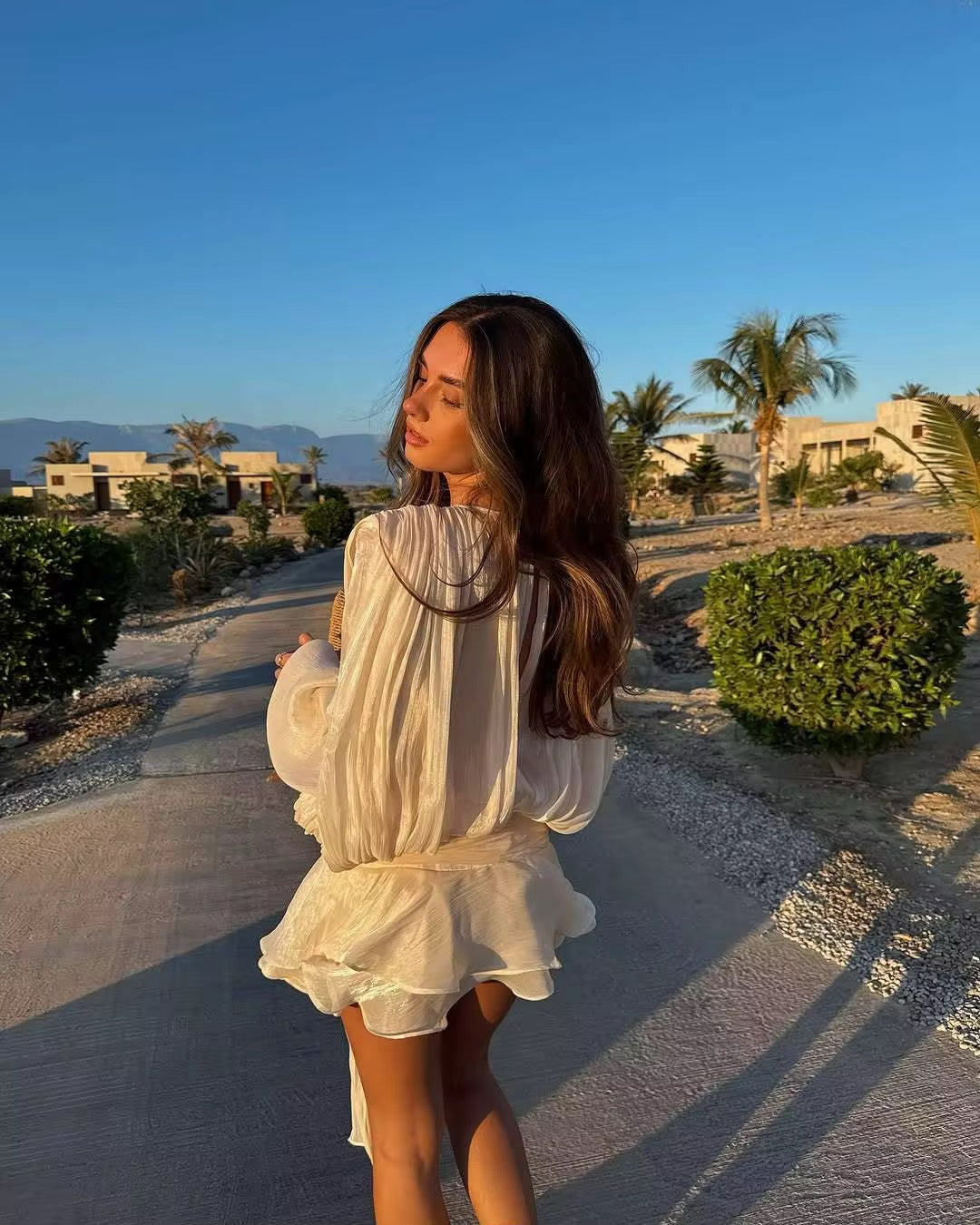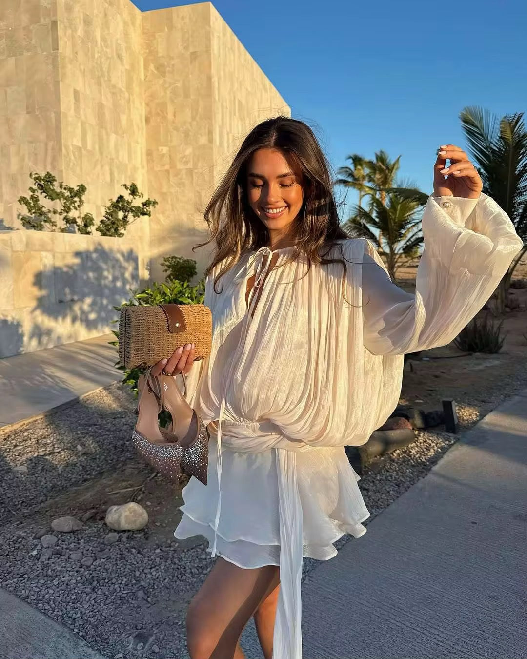 Effortlessly romantic, this flowing blouse-dress captures Belle Chose’s signature balance of elegance and ease. Crafted in a soft, luminous fabric with delicate pleats, it drapes gracefully from a gathered neckline with subtle tie detail. The cinched waist and layered hem create natural movement, while the included under shorts provide confident coverage for all-day wear. Perfect for slow brunches, summer evenings, or elevated everyday dressing, this versatile piece pairs beautifully with sandals, linen layers, or statement accessories.