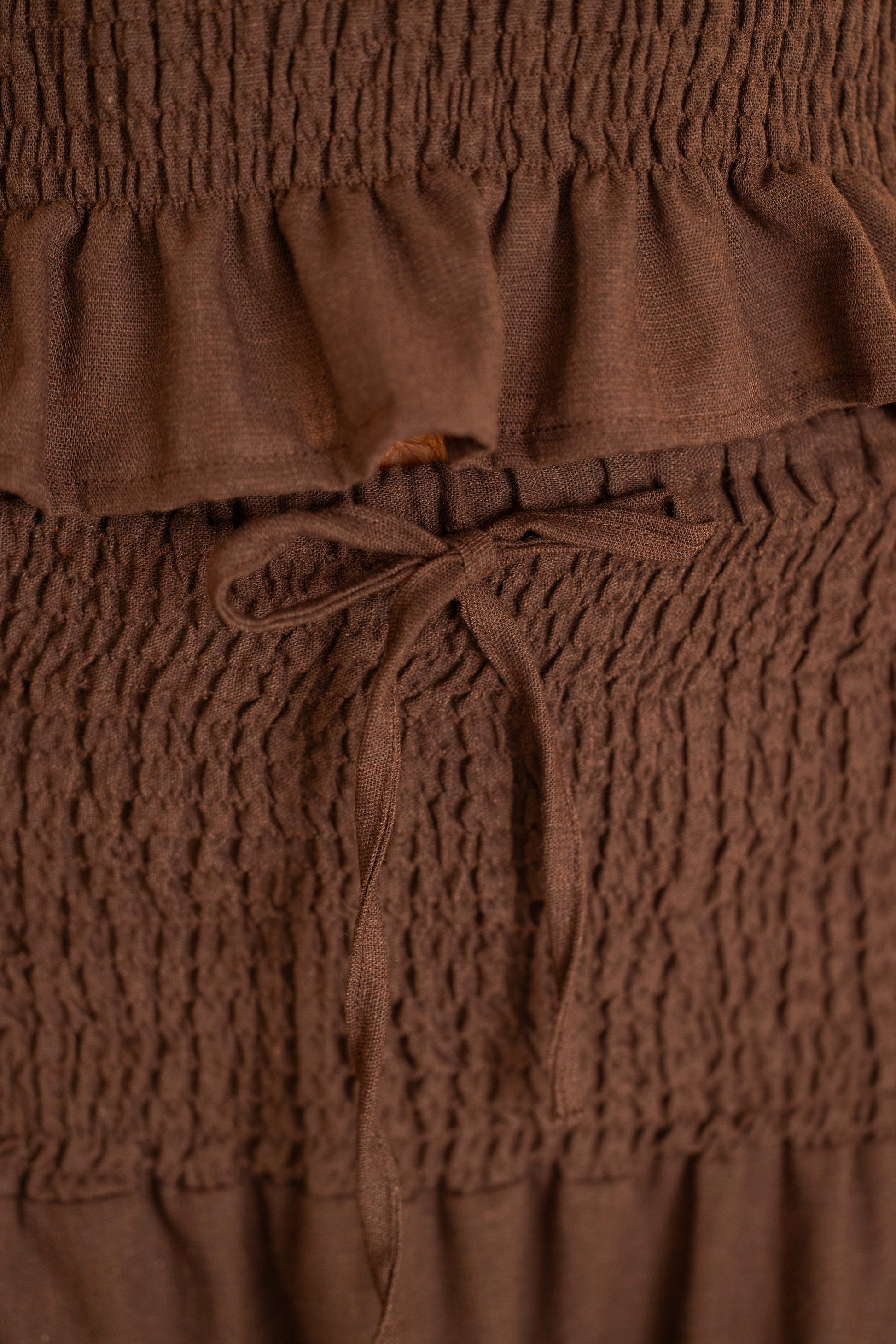 The sun drift Smocked Maxi Skirt in mocha is a flowy, feminine essential designed for comfort and movement. Featuring a wide smocked waistband with an adjustable tie and soft stretch fit, this skirt flatters your silhouette while staying effortlessly relaxed. The lightweight fabric drapes beautifully, finished with a subtle front slit for added ease and elegance. Made to pair seamlessly with the sun drift Top or worn solo with your favourite basics, this skirt is perfect for beach days, brunches, and barefoot mornings. Jemima is xs and 172cm and wears a size xs