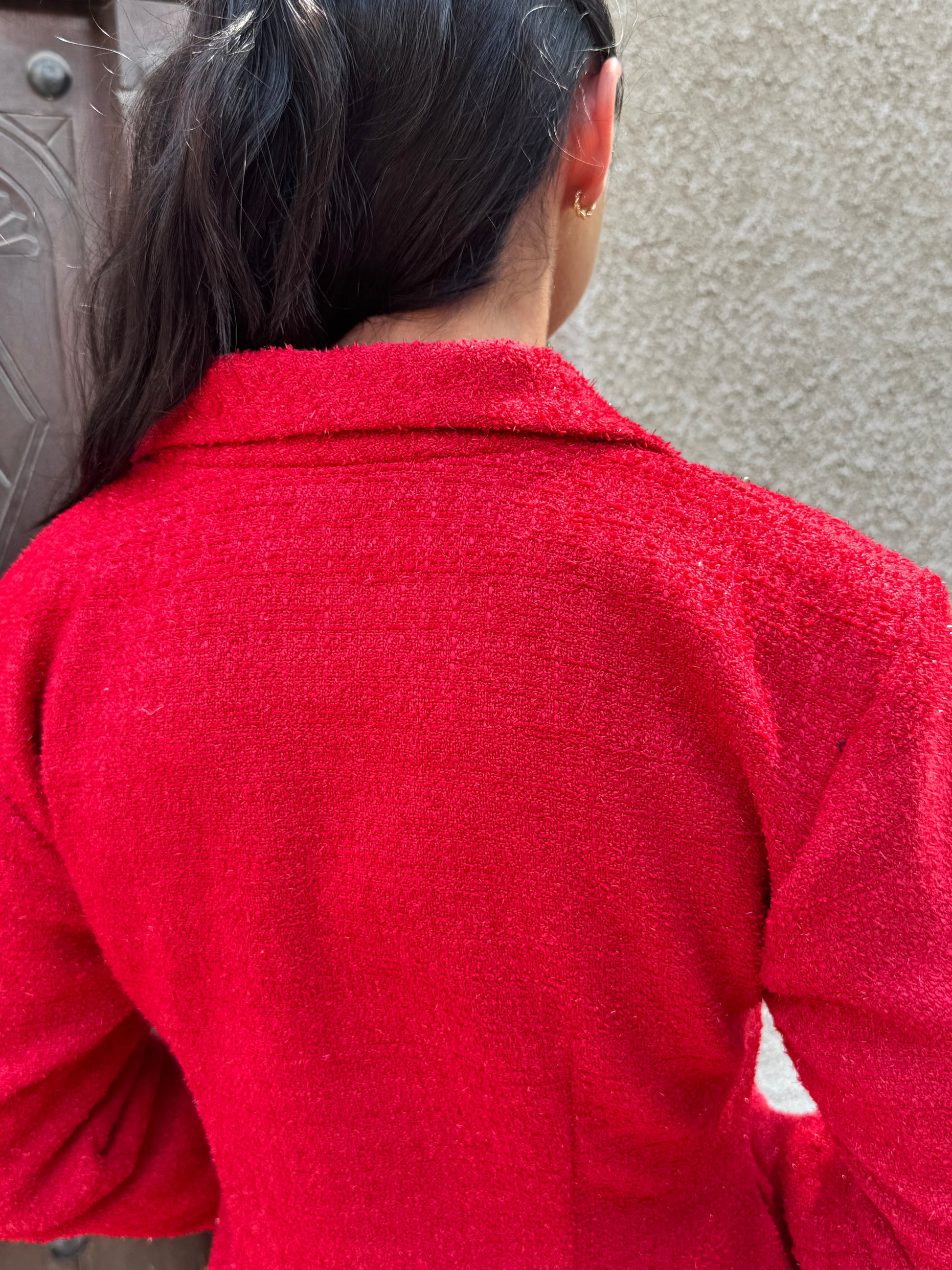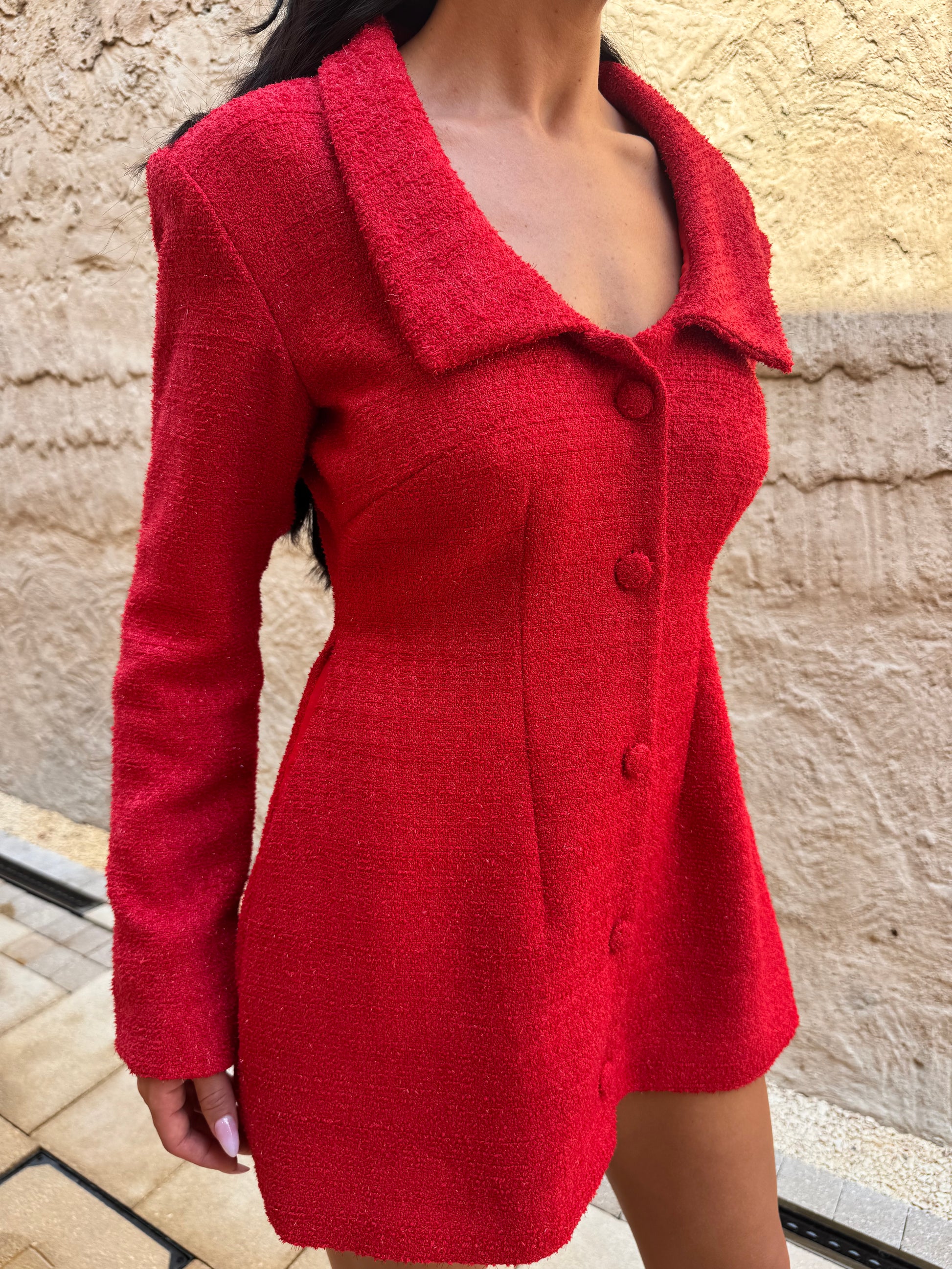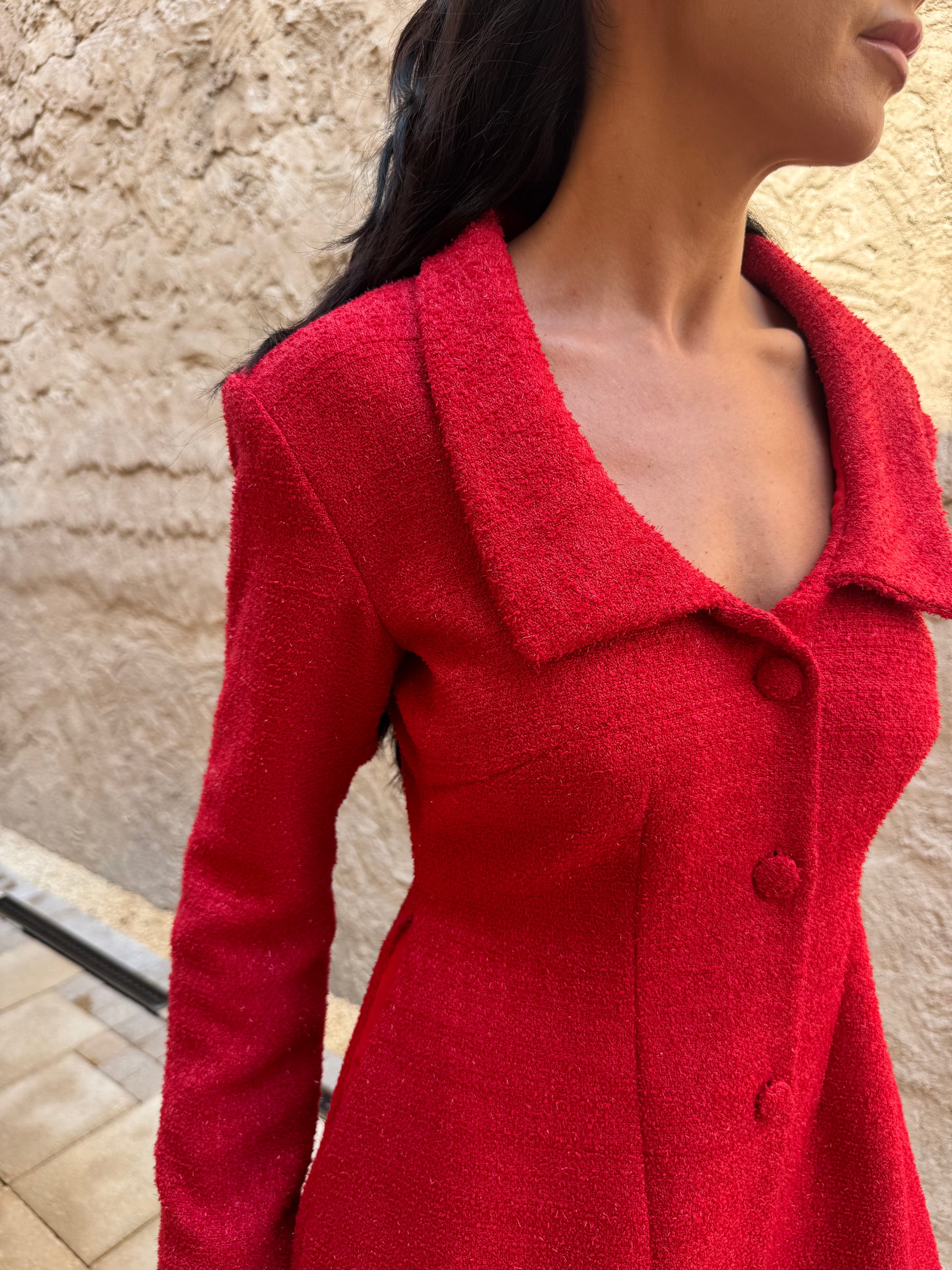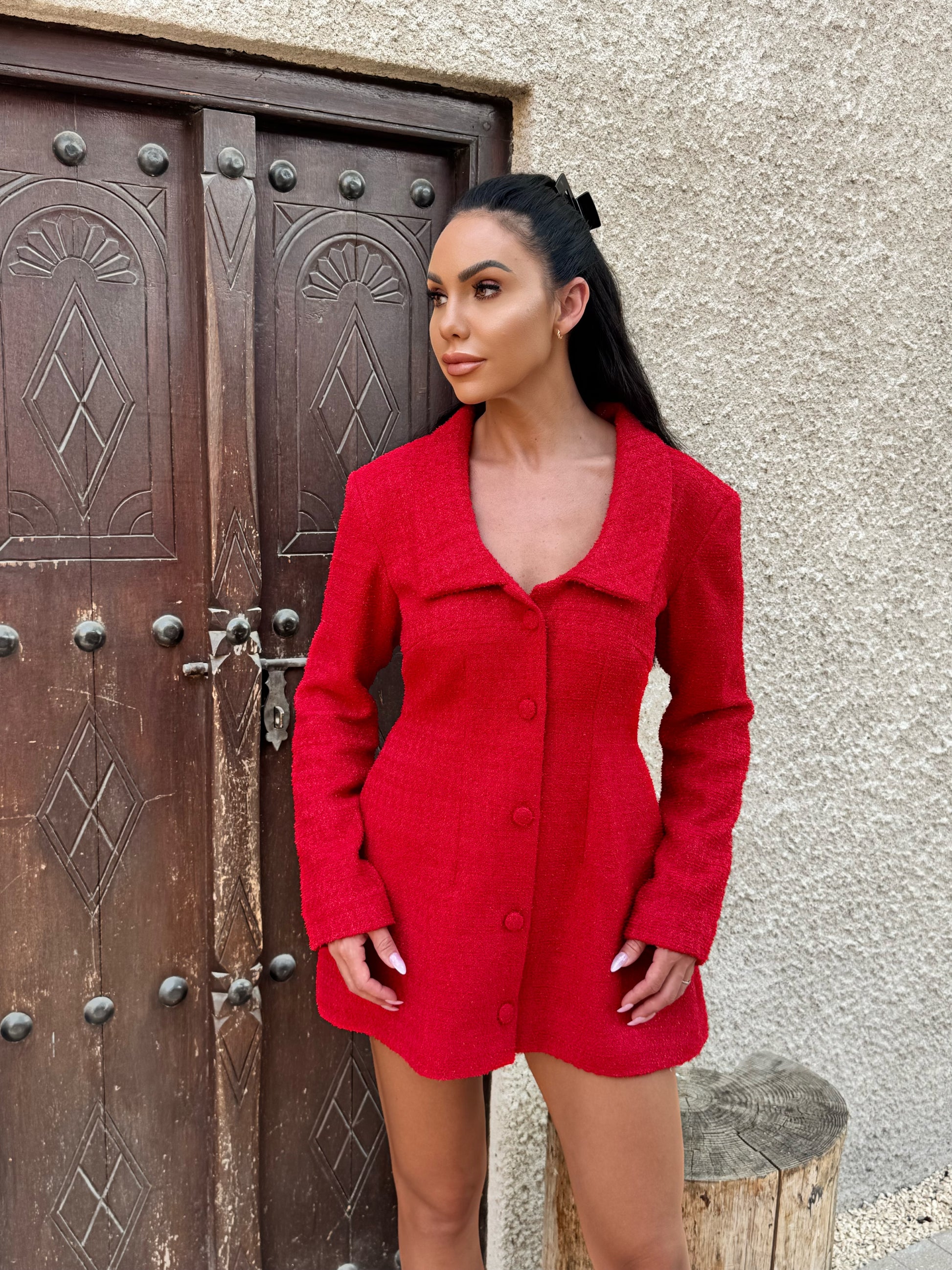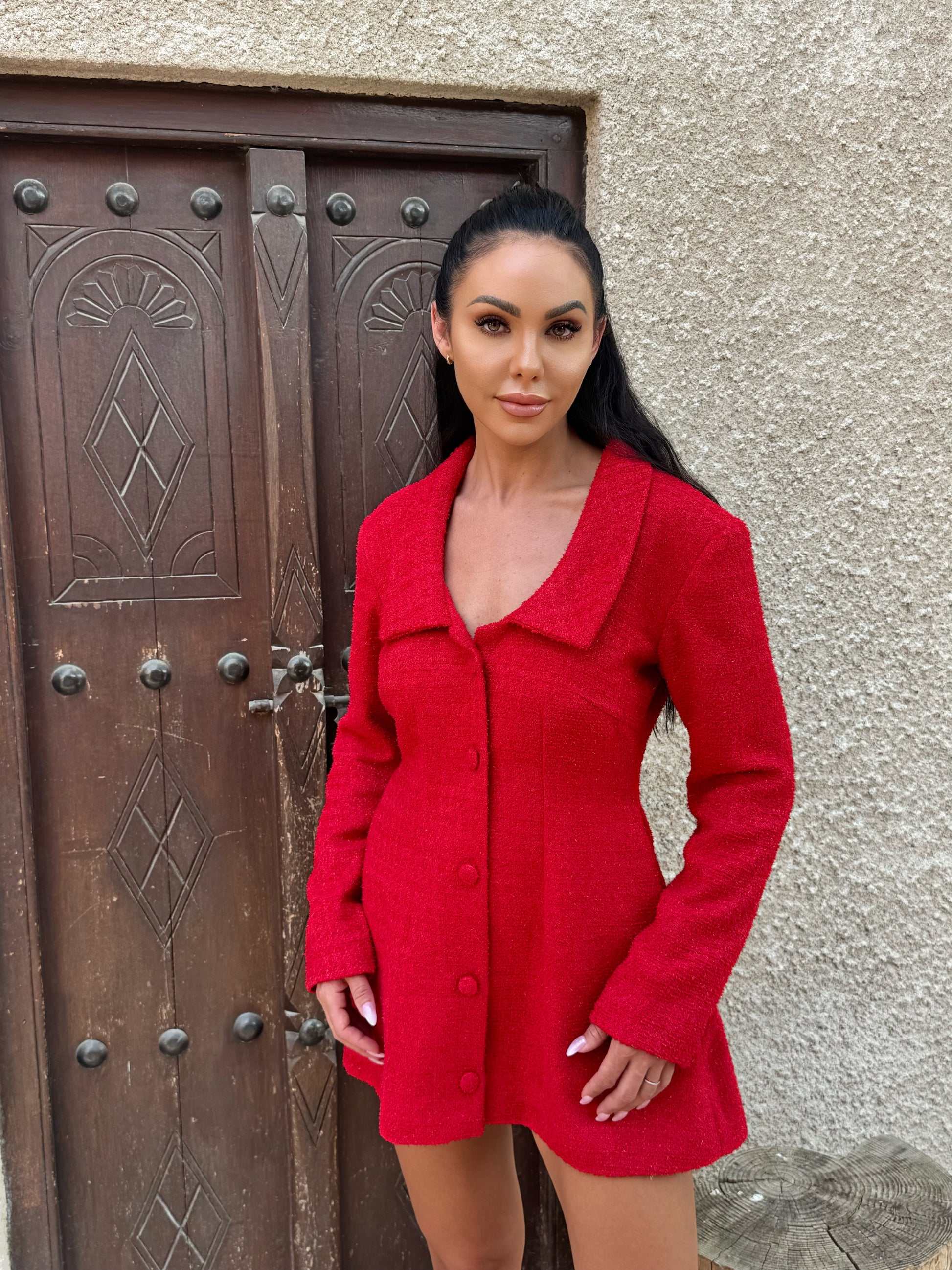 Step into the season of celebration with the Holly Coat Dress, a festive showstopper in rich, statement red. Designed with a tailored silhouette and a flattering mini length, this piece combines the sophistication of a coat with the charm of a dress. Featuring covered buttons and a wide, structured collar, it’s the perfect balance of classic and modern effortlessly chic for Christmas dinners, holiday parties, or a stylish winter brunch. Style Notes: Pair with heeled boots or pointed pumps and gold accessories for a polished festive look.