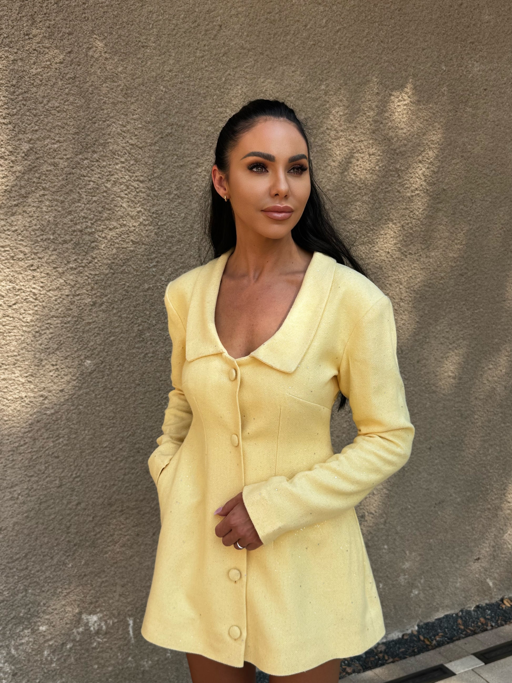 Feminine, bold, and irresistibly festive the Rosé Coat Dress captures the spirit of celebration in a soft, shimmering pink hue. Designed in a textured fabric with a subtle glisten that catches the light, this flattering mini features a structured collar, covered buttons, and a tailored silhouette that hugs the waist before flaring gently. Perfect for holiday brunches, soirées, or a romantic night out it’s playful yet sophisticated, embodying modern glamour with timeless charm. Available in: Pink Style Notes: Pair with nude heels and gold jewellery for an elegant festive look, or add sparkly accessories for a statement evening ensemble.